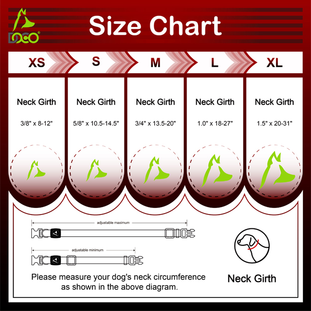 DOCO® Signature Nylon Collar is constructed with HIGH quality nylon and plastic fittings that provides a comfort fit between your dog's collar and neck. Collar has quick release plastic buckle and tri-glide for an easy fitting on your dog. Heavy-duty stitching for lasting quality Metal D-Ring for attaching leashes and ID attachment for your dog's tags and leashes. Comfortable to wear, solid and vibrant colors are easy to see.