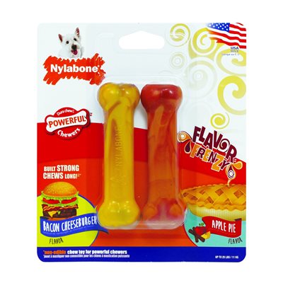 Powerful chompers have finally met their tasty match with the Nylabone DuraChew Flavor Frenzy Bacon Cheeseburger & Apple Pie Flavored Bone Dog Toys. Designed to hold up to tough chewers, these chew toys gives bored dogs something to sink their teeth into, while their unique texture encourages dental stimulation—offering two convenient uses in one delicious package. And because your dog is always begging for a bite of your food, the savory cheeseburger and pie flavors are made to taste just like the real deal. Try a different flavor in every room! And they're made in the USA