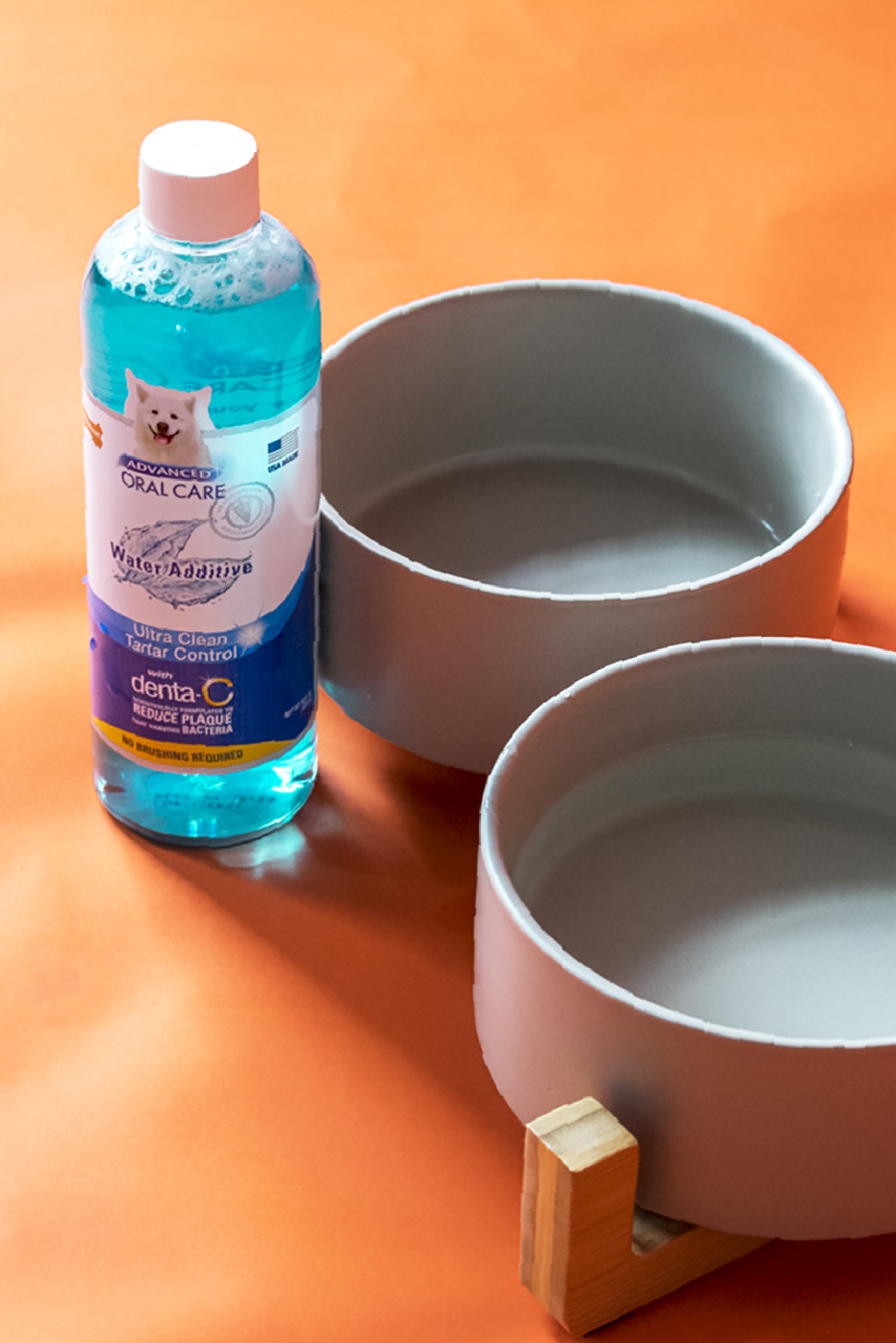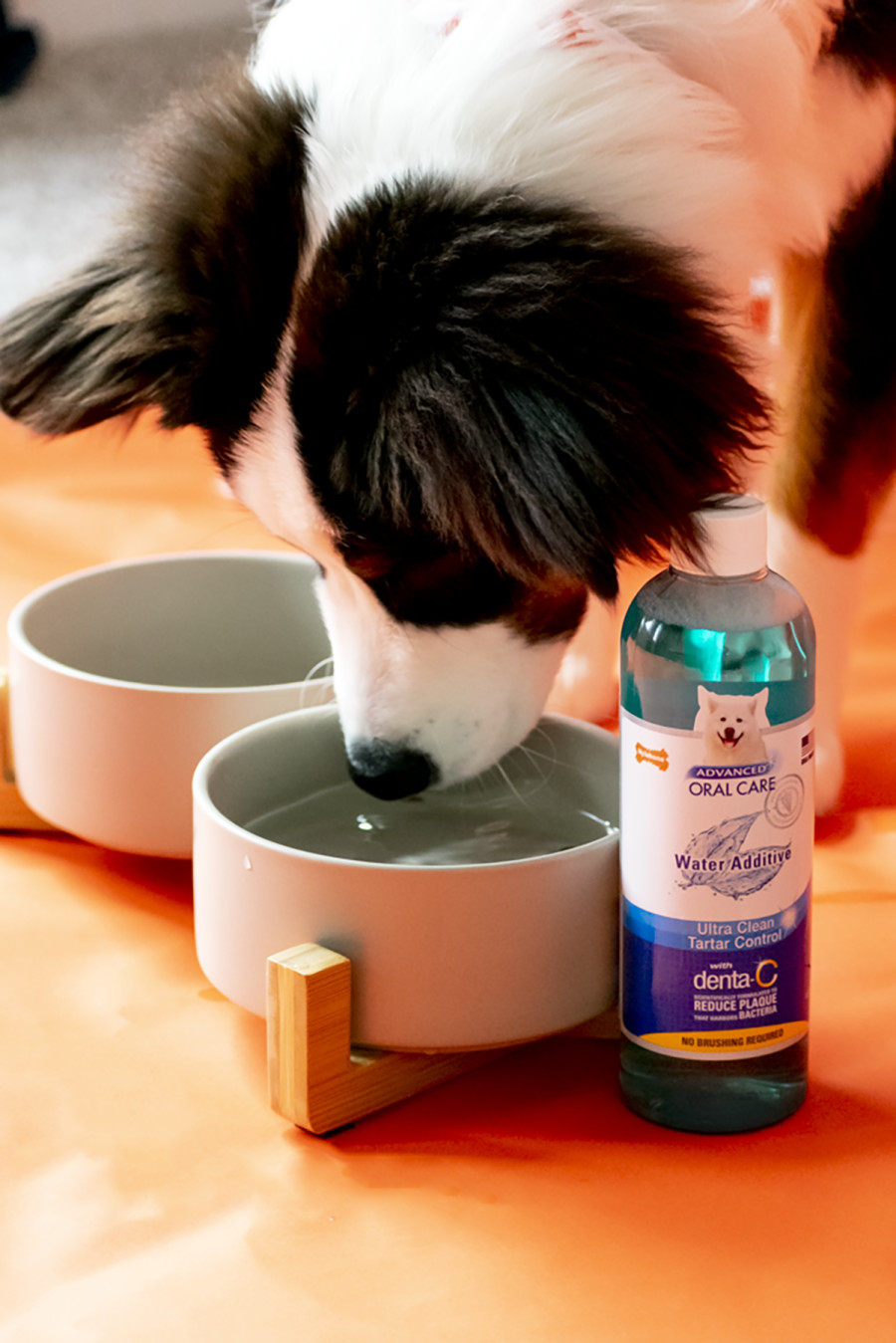 Cleaning your dogs teeth is as easy as taking a drink! Add Advanced Oral Care Water Additive Liquid Tartar Remover for dogs to your poochs water bowl and help them enjoy fresher breath and cleaner teeth. Our dental care formula contains Denta-C, which is scientifically formulated to help reduce plaque that harbors bacteria by altering the pH of your dogs saliva. Just one tablespoon of our liquid tartar remover is all it takes to help lower the risk of periodontal disease. Use this veterinarian-recommended dog oral care solution to complement regular brushing or use it on its own for easy daily maintenance.