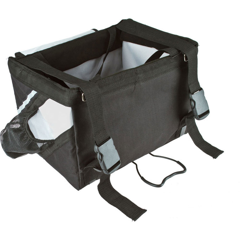 The Pet Life Fur cycle collapsible Dog Bike Carrier easily straps on and connects to the font of the bicycle handle bars by both Nylon and Velcro straps....