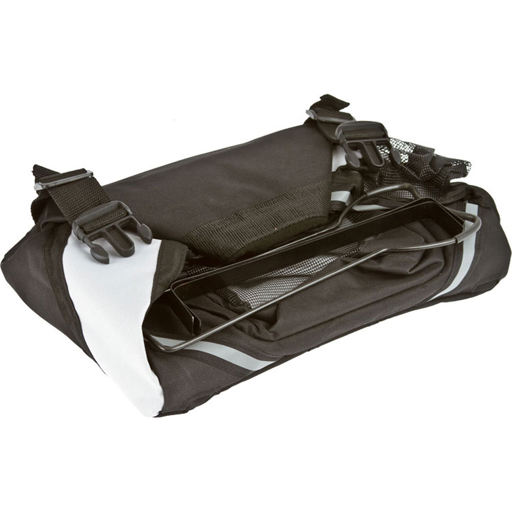 The Pet Life Fur cycle collapsible Dog Bike Carrier easily straps on and connects to the font of the bicycle handle bars by both Nylon and Velcro straps. Features an inner safety leash that connects to any harness or collar for added safety when riding with a durable bottom to support proper weight. Composed of Durable Oxford Nylon with a surrounded lightweight steel metal frame for added support. The Fur cycle also features a frontal Velcro pouch and mesh sided pockets for any added belongings and an zippered entrance at the zip for added visibility. Meant for smaller pets or puppies. SIZING DIMENSIONS: (INCHES) L x W x H: 14.97 x 9.84 x 9.84 Attaches to the handle bar or back of any conventional bicycle Features an above top zippered mesh opening for breathability and sun view features a safety leash attachment inside for added safety protection Features a frontal Velcro pocket perfect for added belongings Completely folds and collapses through the durable metal framing, perfect for travel or storage