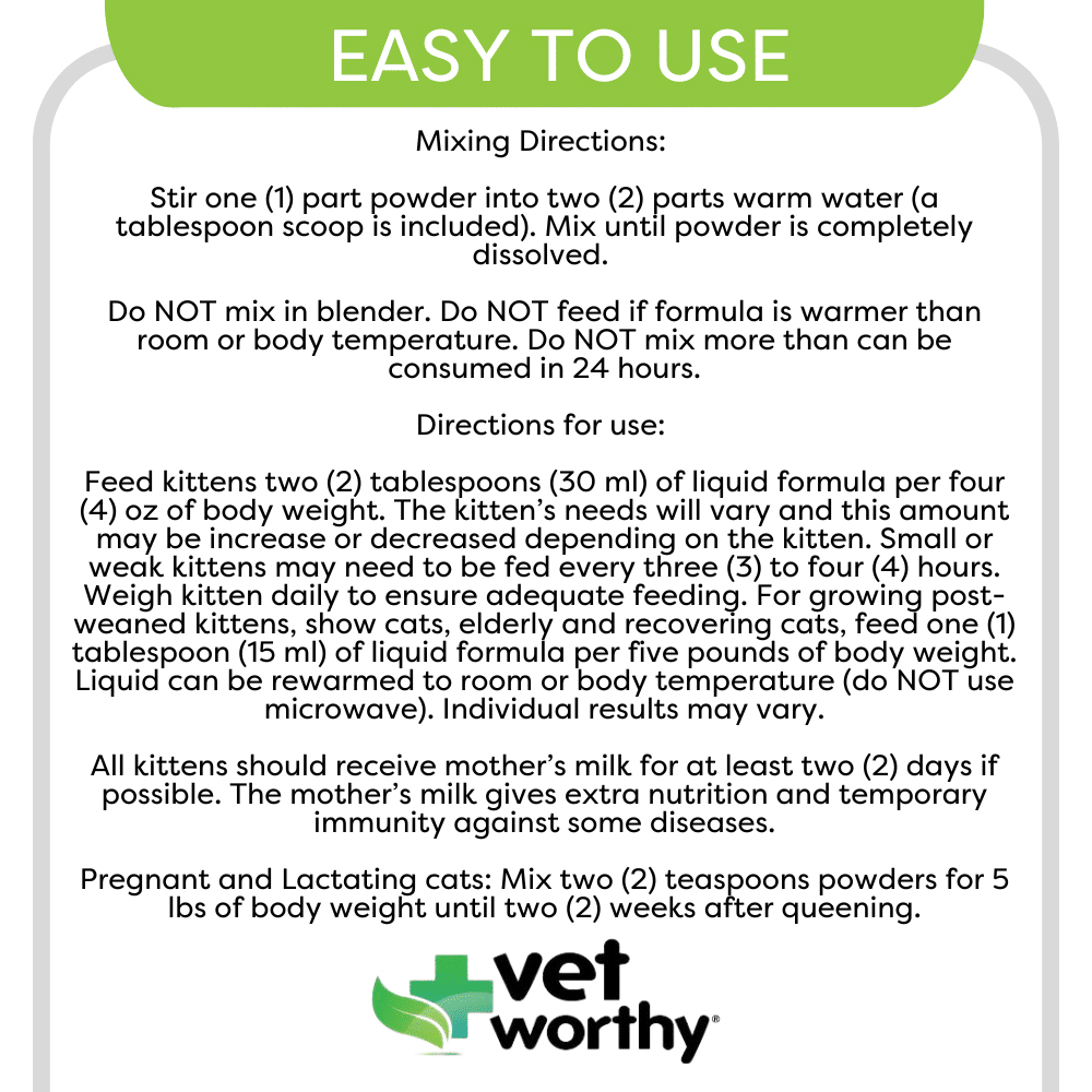 Nutritional Supplement: This cat milk replacement is enriched with colostrum to supply important vitamins and minerals to ensure proper development and growth. Recommended for kittens, pregnant, lactating, elderly, or recovering cats.