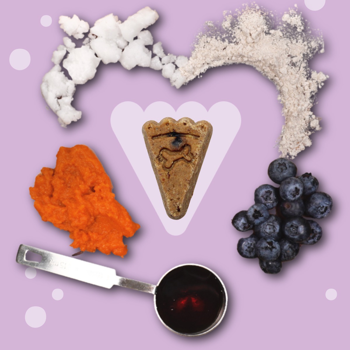 Oat Flour, Blueberry, Pumpkin, Coconut, Coconut Oil and Cane Molasses.