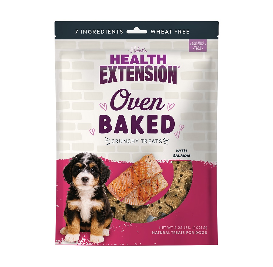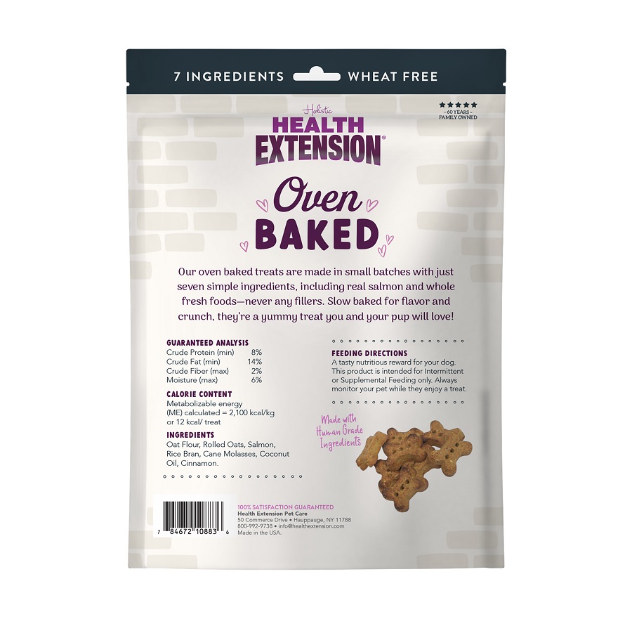 Treat your pup to the simple goodness of Health Extension Oven Baked Salmon Dog Treats. A wholesome, crunchy snacks made in small batches. Each treat features just seven simple ingredients including salmon, coconut oil, and hearty oats for a naturally delicious flavor dogs love. Free from wheat, fillers, or artificial additives, these oven-baked bites are slow-cooked for the perfect crunch and irresistible aroma. Whether you’re rewarding good behavior or sharing a moment of joy, these treats deliver pure, wholesome satisfaction in every bite. Made with human-grade ingredients you can feel good about. Available in 6oz and 2.25lb bags.
