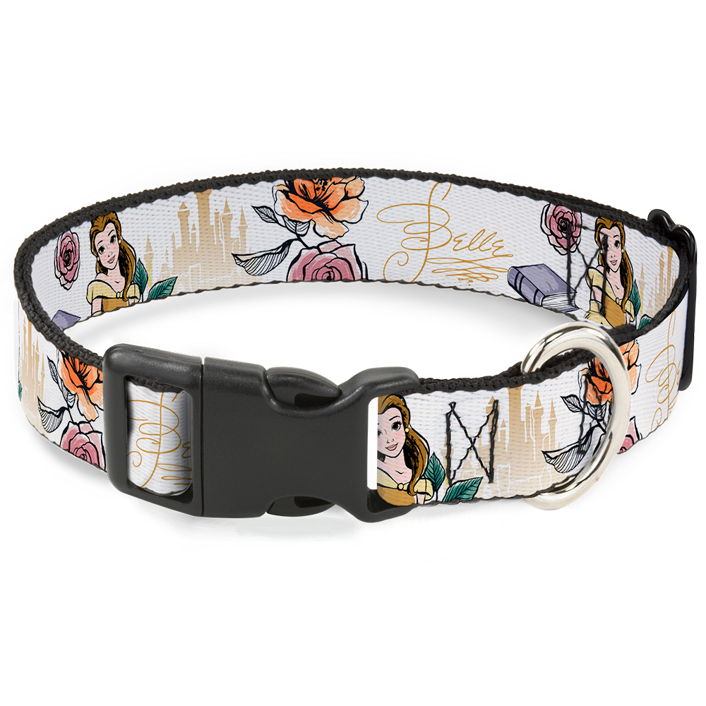 Plastic Clip Collar - Beauty and the Beast Belle Castle Pose with Script and Flowers White/Yellows