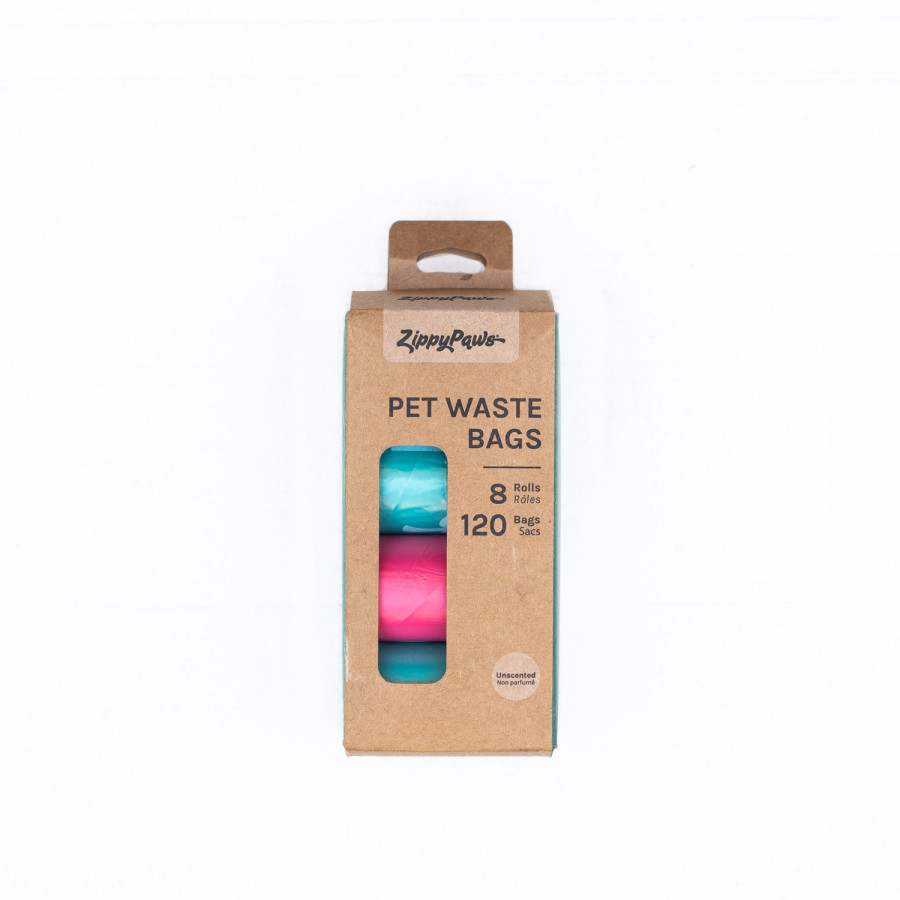The Zippy Paws Pet Waste Bags are thick bags making it easy and convenient to use when cleaning up after dogs of all sizes. These bags include handles for easy waste management, simply tie up the bag and trap the odours inside. Each roll contains 15 bags making the roll a nice and easy fit in standard waste bag dispensers. These rolls are great to carry on your or pair with the Zippy Paws Adventure Leash Waste bag dispenser.