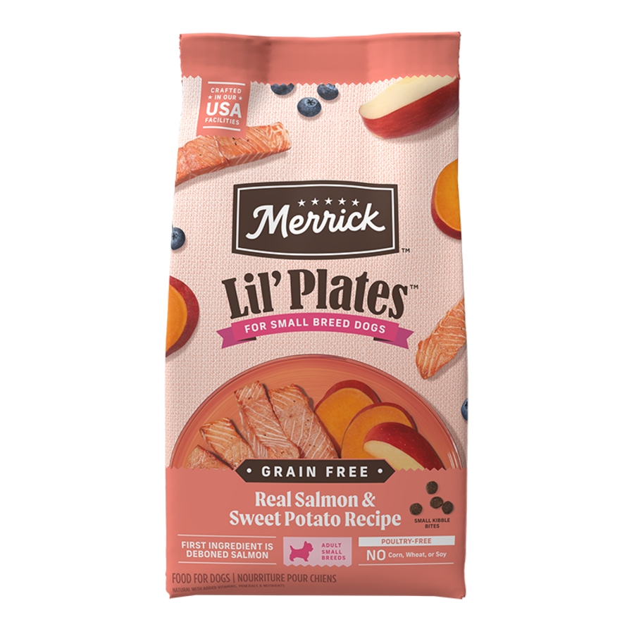 Merrick Lil Plates Grain Free Dry Dog Food caters to the big appetites of small pups. This nutritious recipe is specially formulated for the unique dietary needs of small breed dogs. The perfectlysized, crunchy bites also help reduce plaque and keep your dogs teeth clean. Real deboned salmon is always the first ingredient. This high quality protein helps build and maintain healthy muscle tissue and energy levels; A good source of omega 3 fatty acids that help support your dogs healthy skin and coat plus probiotics and prebiotic fiber for healthy digestion and glucosamine and chondroitin for healthy joints; Real whole foods like sweet potatoes, potatoes, peas, apples and blueberries offer vitamins, minerals and antioxidants; All Merrick recipes are crafted in our Hereford, TX kitchen and cooked in the USA, in facilities that uphold strict FDA guidelines