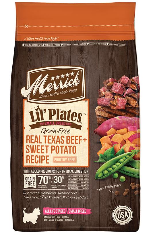 Merrick Lil' Plates Grain Free Dry Dog Food caters to the big appetites of small pups. This nutritious recipe is specially formulated for the unique dietary needs of small breed dogs. The perfectly sized, crunchy bites also help reduce plaque and keep your dog?s teeth clean. Real deboned beef is always the first ingredient. This high quality protein helps build and maintain healthy muscle tissue and energy levels.