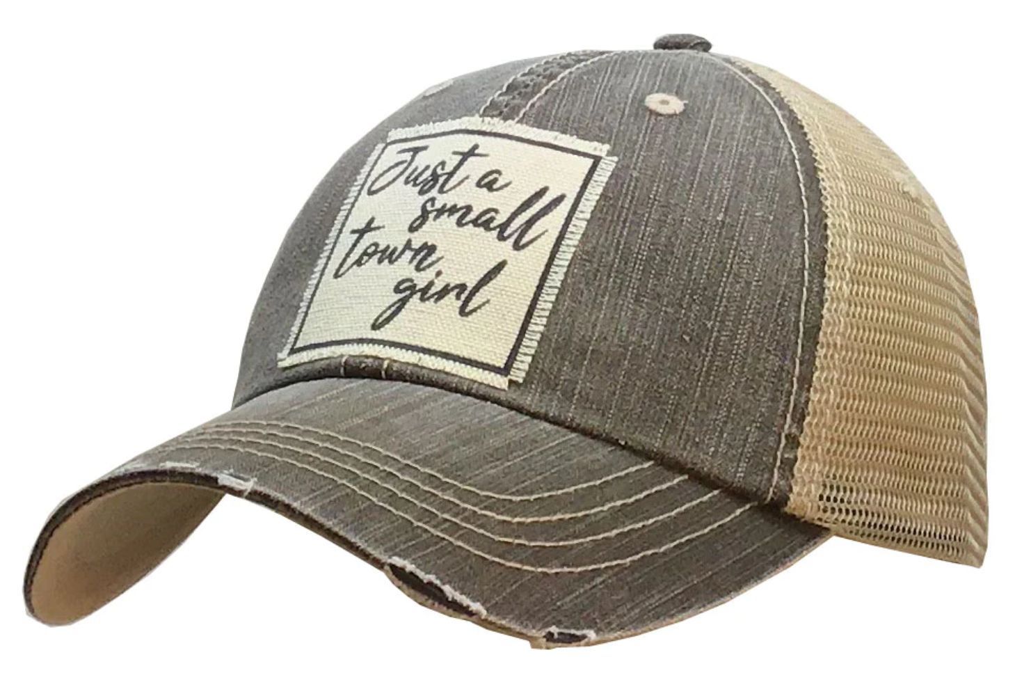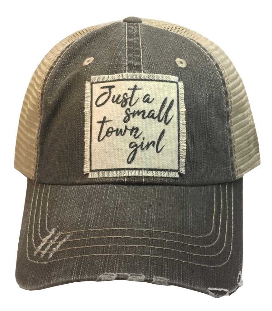 Vintage Distressed Trucker Cap "Just A Small Town Girl"Color: Light Brown Distressed Material: Cotton/Polyester blend, Mesh backSize: One size fits most,...
