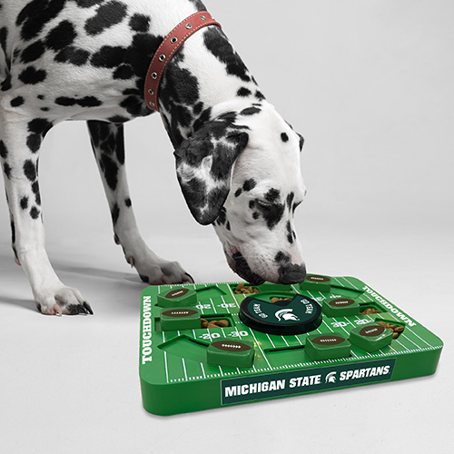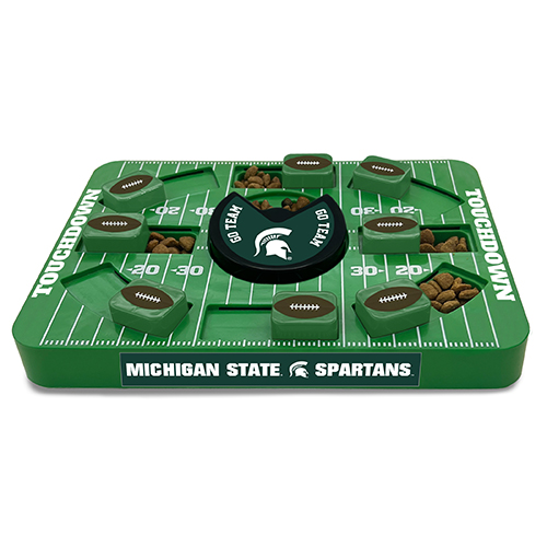 We are introducing our interactive LARGE puzzle pet toy! Make playtime exciting and engaging for your furry friend with this innovative toy. The puzzle toy features a fun football field design with paw print graphics, and it's available in over 50 College teams! Get ready to score big with the Pets First Interactive Puzzle Dog Toy!