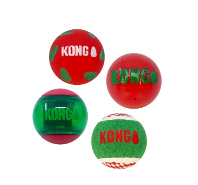 KONG Holiday Occasions Balls 4-pack delivers a variety of seasonal play in one pack! Some with squeakers and some without, the varying textures of these balls will satisfy chasing and retrieving instincts. This merry version of KONG Signature balls will surely bring joy this holiday season.