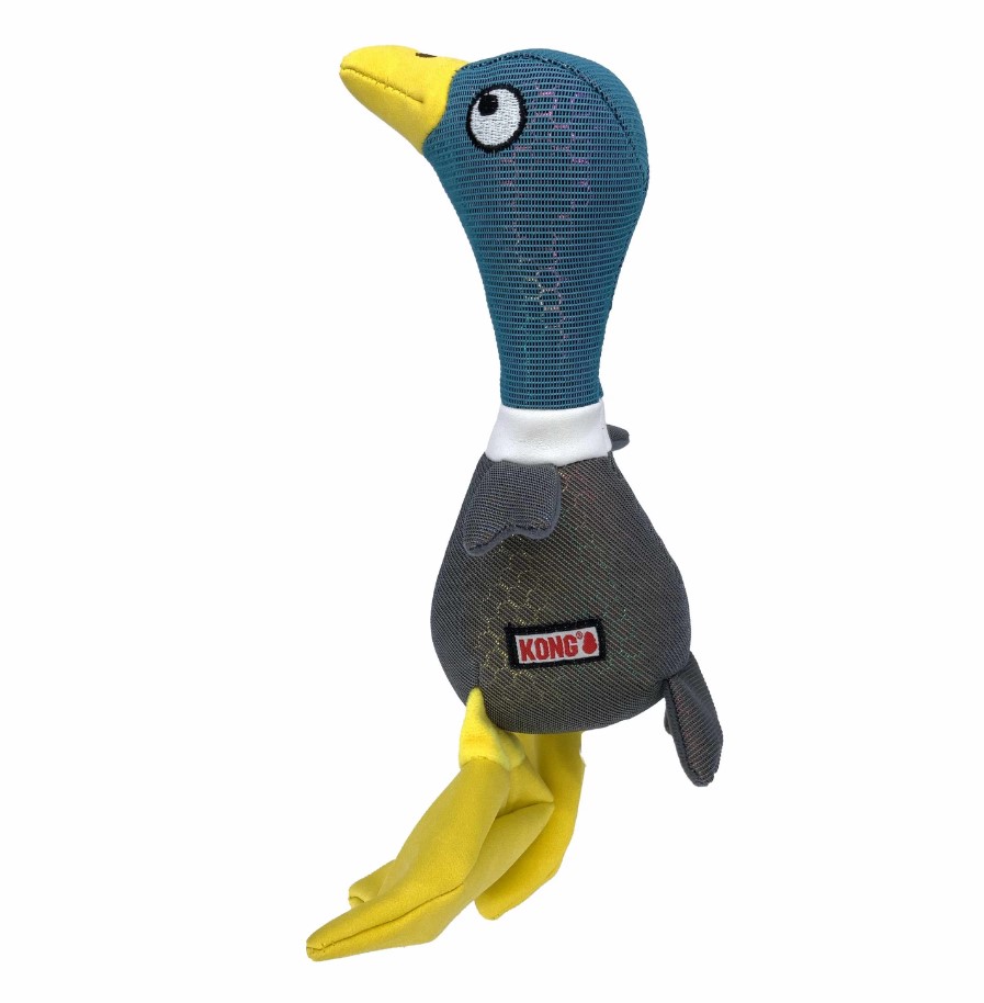 KONG Shakers Shimmy Mallard’s Giant floppy feet flap fabulously, inviting instinct-satisfying bouts of thrashing. Faux leather, shimmery and plush textures keep pups interested while a low-tone squeaker and crackle spark shaking shenanigans for tons of healthy exercise.
