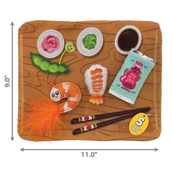 Special Features5-toys-in-1 for endless play variety Crackly sushi board base ideal for wrestling fun Varied pull-a-part toys entice stalk & grab play Lightweight toys spark batting and pouncing instincts Attached toys contain KONG Premium North American Catnip to extend fun
