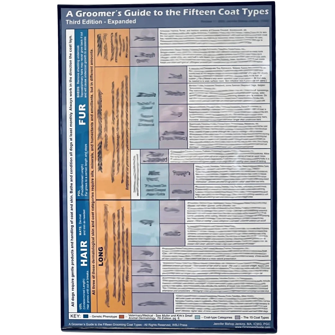 Jennifer Bishop Jenkins 15 Coat Types Poster (24"x36") is the perfect educational poster for dog grooming professionals and dog parents.