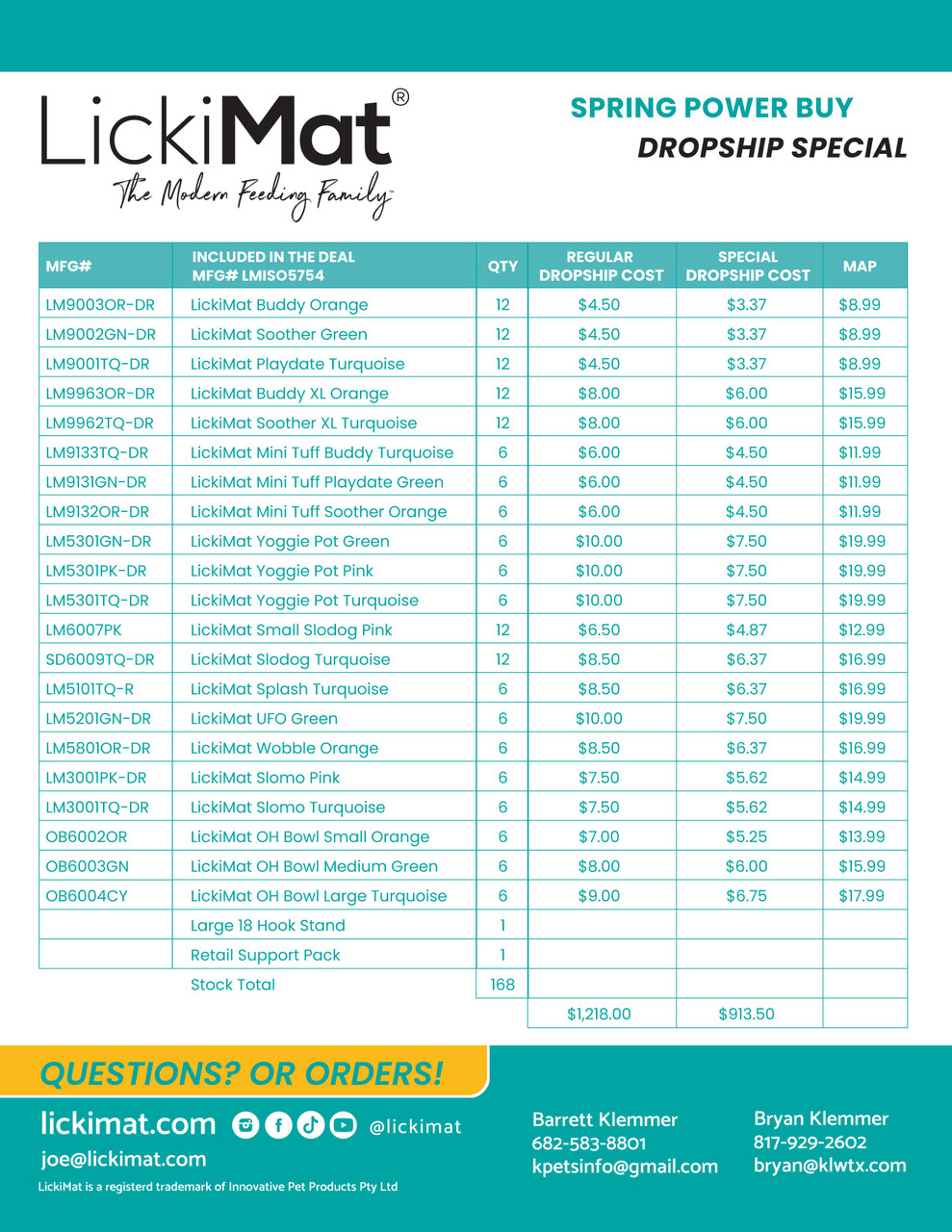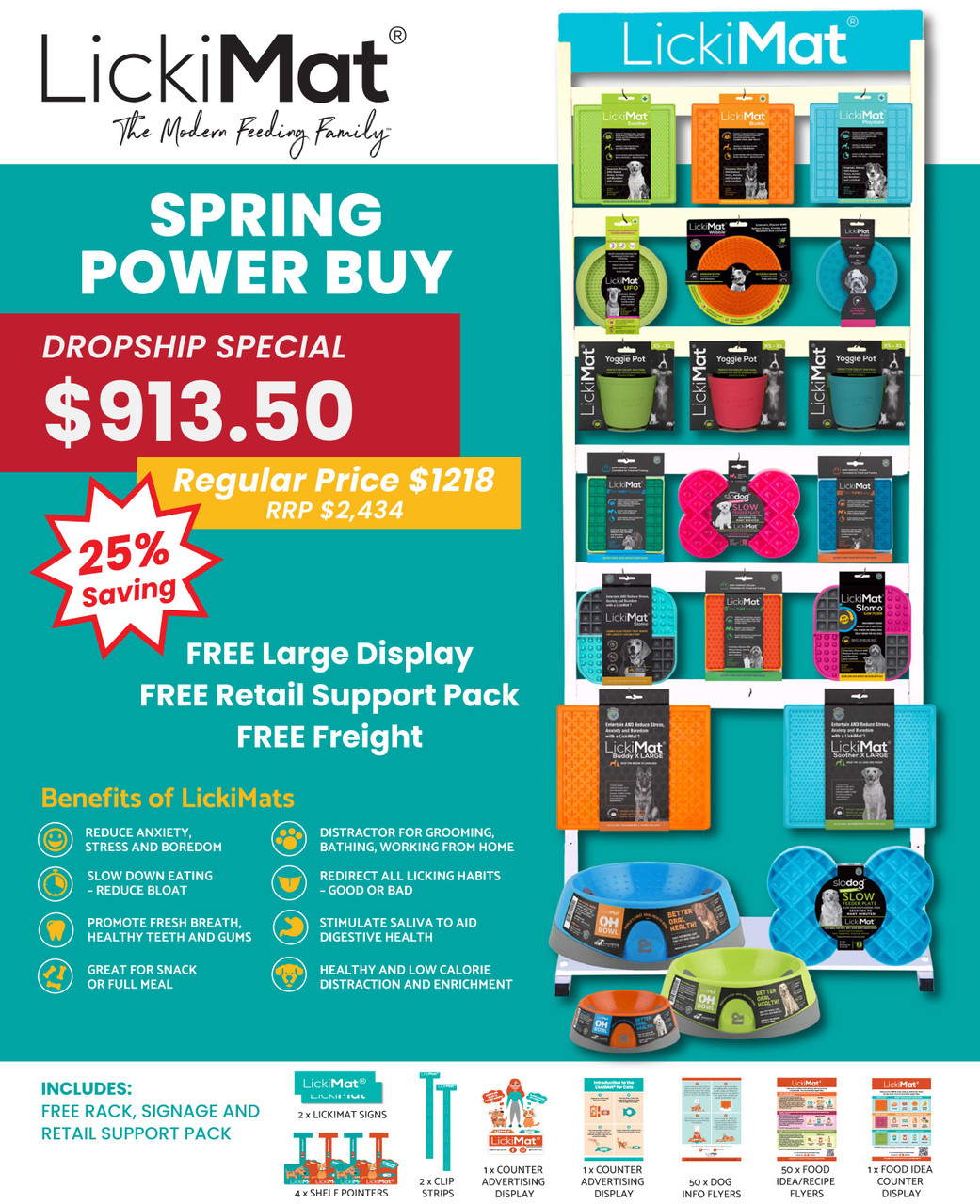 Introducing the LickiMat® Spring Power Buy Bundle – a curated collection of premium feeding and enrichment tools for pets at an exclusive wholesale price. This offer is designed to support pet retailers with unbeatable value, educational resources, and eye-catching displays to boost in-store sales.
