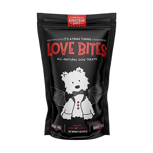Halloween Love Bites. Small batched natural organic dog treats. For you or given as a gift - and provide a nutritious, made in the USA, super food snack for your four-legged friends. And, who's more deserving of a great gift than our loyal four-legged friends? Coconut based treats. Woof! Einstein Pets is all-natural omega premium balanced nutritional dog treats loaded with high-quality, unprocessed and clean ingredients and are made from scratch in small batches by hand. No chemicals or preservatives. Oat-flour based, mineral rich, and high in essential DHA Omega 3 & 6. This dog treat makes for a nutrient-dense cookie, high in fiber and protein, thus creating sustained energy. INGREDIENTS: Coconut, Oat Flour, Carob, Honey, Vanilla, and Chia Seed.