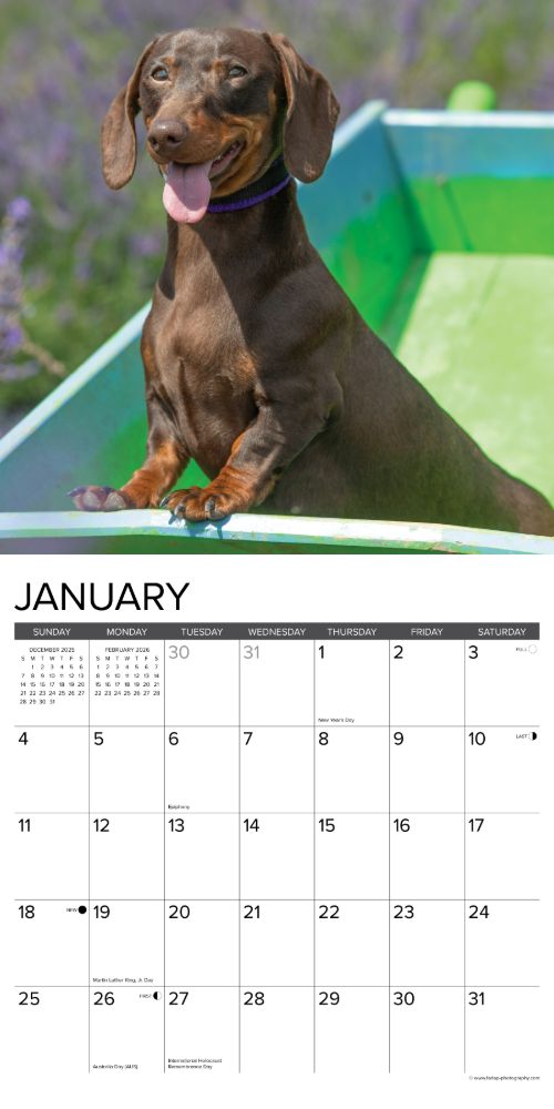 Miniature Dachshunds are tiny dogs packed with personality. Twelve charming photographs celebrate their highspirits, lovability and loyalty. Stay organized in the upcoming year with a Willow Creek Press 2026 12" x 12" Wall Calendar. This calendar features large grids for easy notation of dates and events, helping you stay efficient and on top of your commitments. Let this calendar guide you to a more organized, successful and fulfilled year ahead. PERFECT GIFT - Look no further for the perfect gift for any special occasion. Make someone's year extra special with one of our 2026 Wall Calendars. Our calendars are the perfect choice for your friends or family, even for those difficult to buy for PLANNING - Stay organized and inspired throughout the year. Ideal calendar for taking notes, recording dates to remember, tracking appointments and assisting in family activity organization INCREDIBLE IMAGES – Crisp, detailed full-color images every month providing Wall art for Home, Office or School LARGE GRIDS – 12” x 12” format, with large daily blocks providing ample writing room SUPERIOR QUALITY – High quality paper stock that lays flat when hanging and offers crisp, bright colors MONTHLY OVERVIEW – Plan ahead or look back with grids of the upcoming and previous months at a glance ECO FRIENDLY – Willow Creek Press is committed to eco-friendly efforts to make our products more sustainable, our 2026 12" x 12" wall calendars are printed with soy-based inks on high-quality FSC certified paper for smooth writing DATE RANGE - 2026 Wall Calendar with 6 bonus months from July-December 2025 BONUS FEATURES –US and International holidays and moon phases (CST) noted on each month for easy tracking This year can be your most successful yet, with this beautiful and brilliant wall calendar. Learn how to become a highly effective person, one month at a time!
