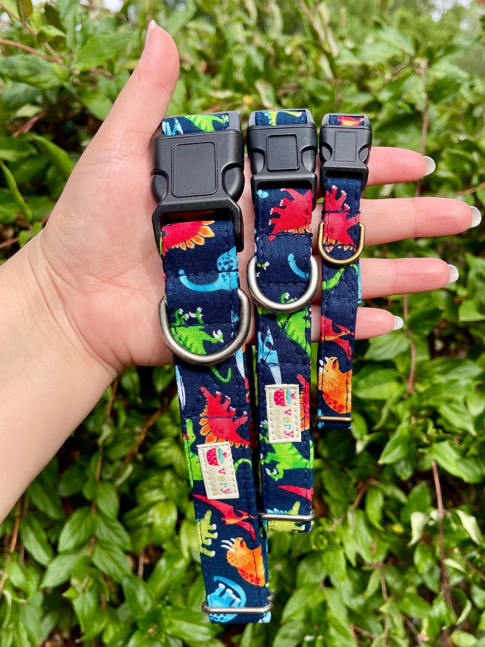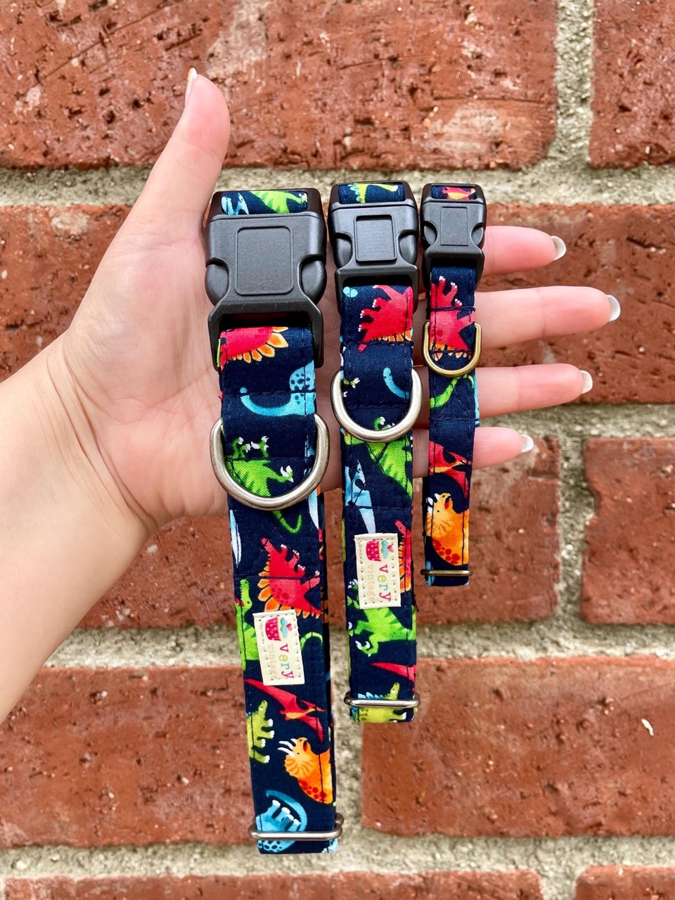 Each collar is finished with a matte black buckle and your choice of antique brass or antique silver hardware. Matching leash available in three widths for a complete prehistoric walk set!