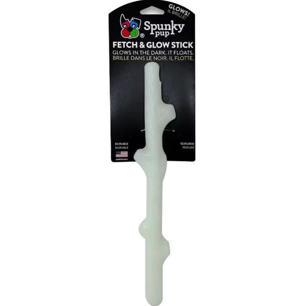 MADE IN THE USA! Now you and your best friend can keep playtime going long after sundown. Just expose the Stick to light and watch it glow in the dark. This soft, durable, non-toxic toy is great for indoor or outdoor play. Say goodbye to drool-encrusted toys – Fetch & Glow by Spunky Pup is easy to clean, waterproof and even floats. So, wherever the fun takes you — to the dog park, the beach, or just around the house — Fetch & Glow will keep your dog running, jumping and fetching … Day or Night! Not recommended for chewing. Designed as a fetch toy.