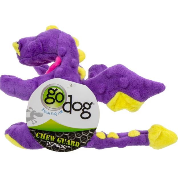 goDog Dragons are whimsical, bright creatures that are as tough as they are cute. Made with dog-preferred bubble plush and lined with Chew Guard, these toys stand up to tough play. Minimal stuffing gives these toys a fun floppy feeling that dogs love. Also available in a long cylinder shape that dogs love to drag, tug, and chase. goDog plush dog toys are designed to be stronger and last longer. Made more durable with Chew Guard Technology™, a manufacturing process that adds reinforced seams and a super tough and durable lining to soft plush toys.