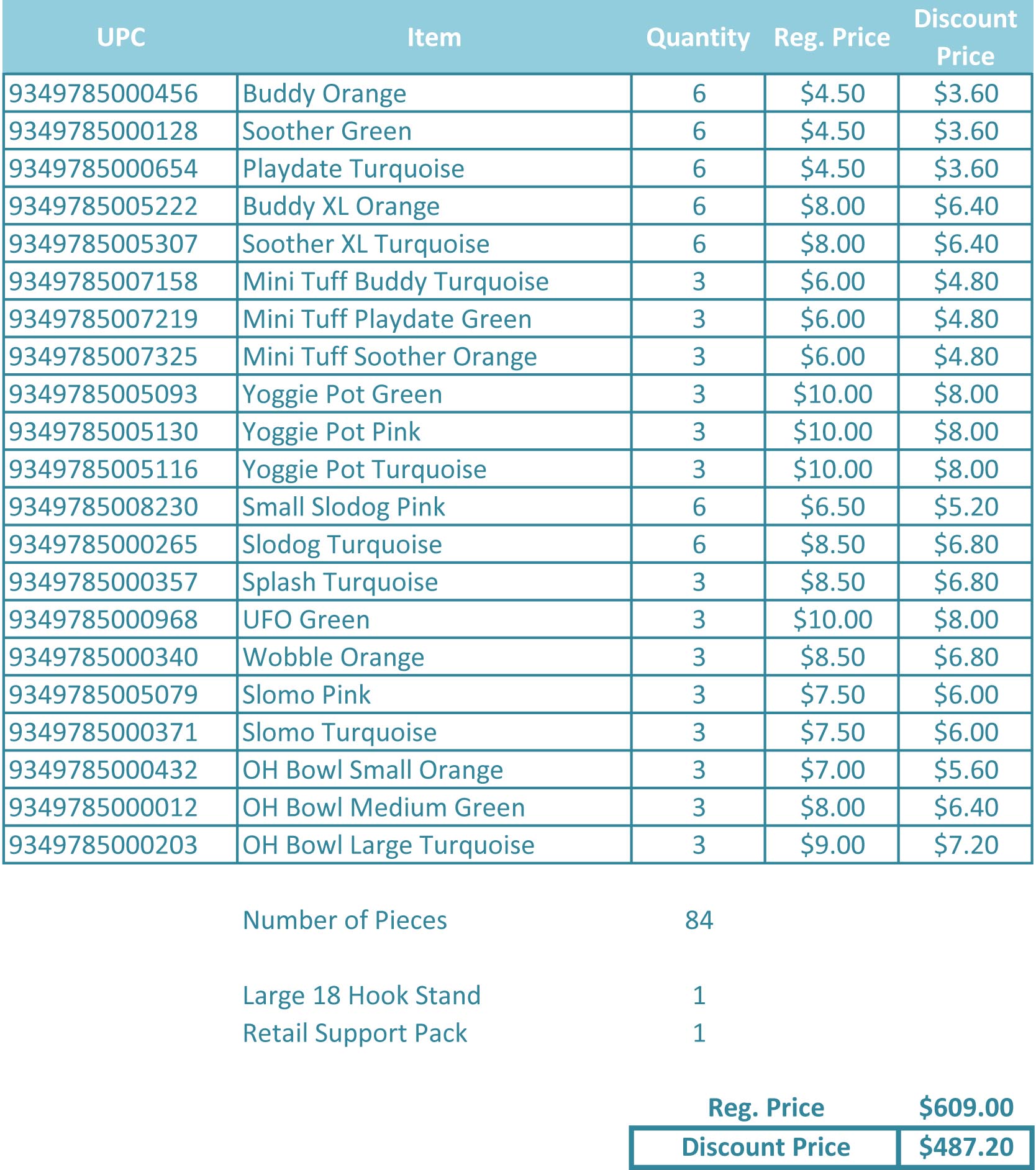 6x Buddy Orange 6x Soother Green 6x Playdate Turquoise 6x Buddy XL Orange 6x Soother XL Turquoise 3x Mini Tuff Buddy Turquoise 3x Mini Tuff Playdate Green 3x Mini Tuff Soother Orange 3x Yoggie Pot Green 3x Yoggie Pot Pink 3x Yoggie Pot Turquoise 6x Small Slodog Pink 6x Slodog Turquoise 3x Splash Turquoise 3x UFO Green 3x Wobble Orange 3x Slomo Pink 3x Slomo Turquoise 3x OH Bowl Small Orange 3x OH Bowl Medium Green 3x OH Bowl Large Turquoise