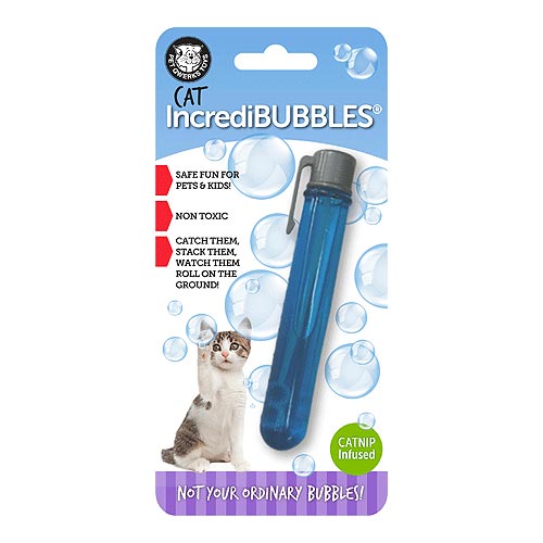 PET QWERKS Cat Incredibubbles Catnip Infused. Incredibubbles don't pop when they touch the ground! Not your average Bubbles! It's Flavor-Infused Bubbles. Safe, fun for pets and kids too! Catch them, stack them, and watch them roll on the ground! Blow the bubbles as high in the air as possible. Catch and hold them in your hand. They will remain un-popped on the floor or lawn. For the best results use your hands to wave the bubbles in the air for a moment. The more seconds they float in the air, the lighter and more durable they become. Bubbles dry in the air, and land on the ground intact, waiting to be attacked by cats and dogs alike. Pets really love chasing and bursting these bubbles! Economical and fantastic fun.
