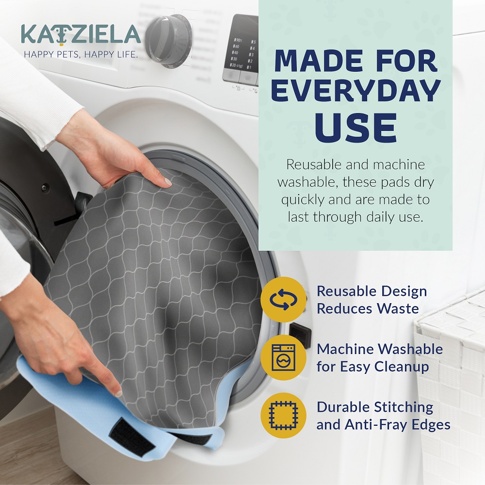 Life with dogs doesn’t always run on schedule. Maybe you’re working late, the weather’s a mess, or your puppy is still learning the ropes. Whatever the reason, Katziela’s reusable quick-drying pads give your pet a clean & comfy place to go… without turning your floors into a minefield. They’re designed to prevent everyday messes in everyday places – and thanks to the stay-in-place hook-and-loop system, the pad doesn’t budge. Use these pads at home, in the car, in crates, or anywhere else your dog needs a reliable spot to go.