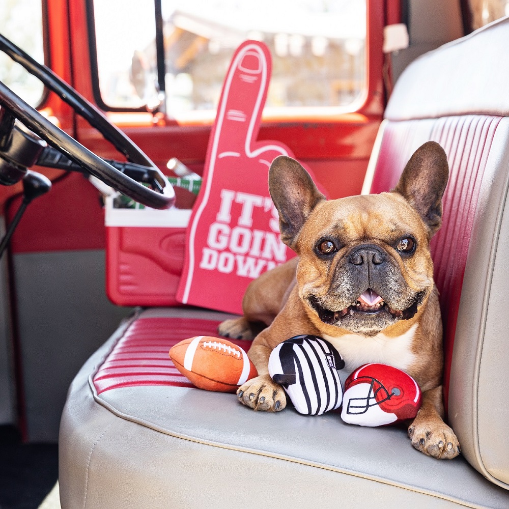 One team, one dream! Our “Whole 9 Yards” 3 piece mini plush toy set is perfect for the pup that likes to play all day. With each toy stuffed with fluff and a loud squeaker, this trio is sure to be a touchdown.