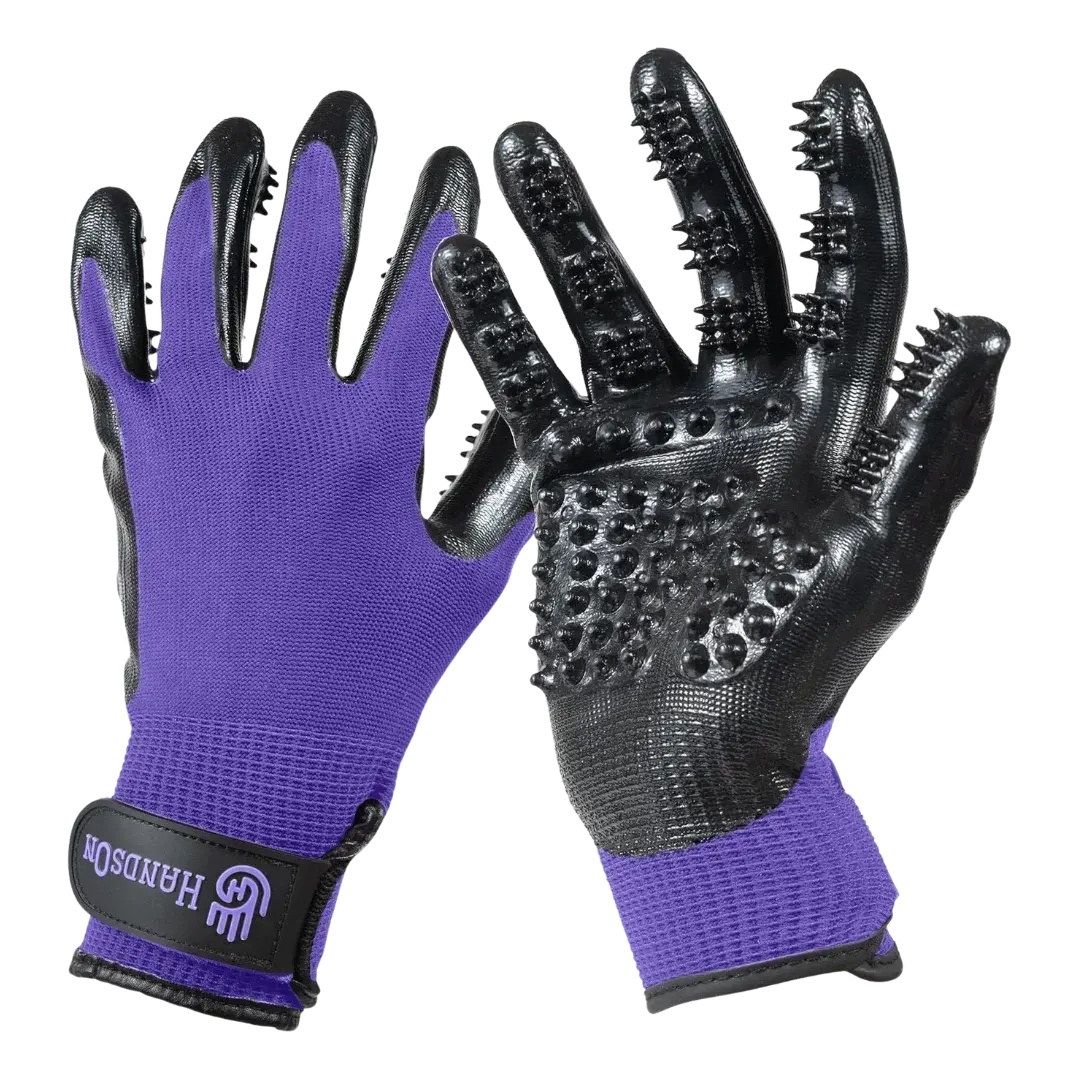 HandsOn Gloves purple monochromatic deshedding gloves designed for gently massaging and removing excess hair from a dog's coat. Perfect for deshedding dogs in the tub or on a dry coat.