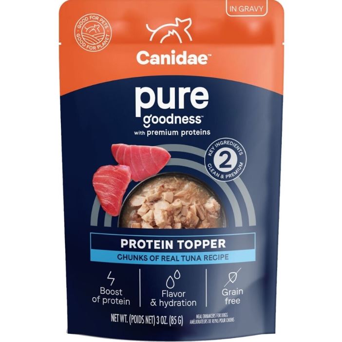 Add a boost of protein, flavor and hydration with Canidae's Pure Protein Toppers. Made with chunks of real Tuna, this is a single animal protein source recipe with only 2 key ingredients. Made without corn, wheat or soy, and no artificial colors, flavors or preservatives.