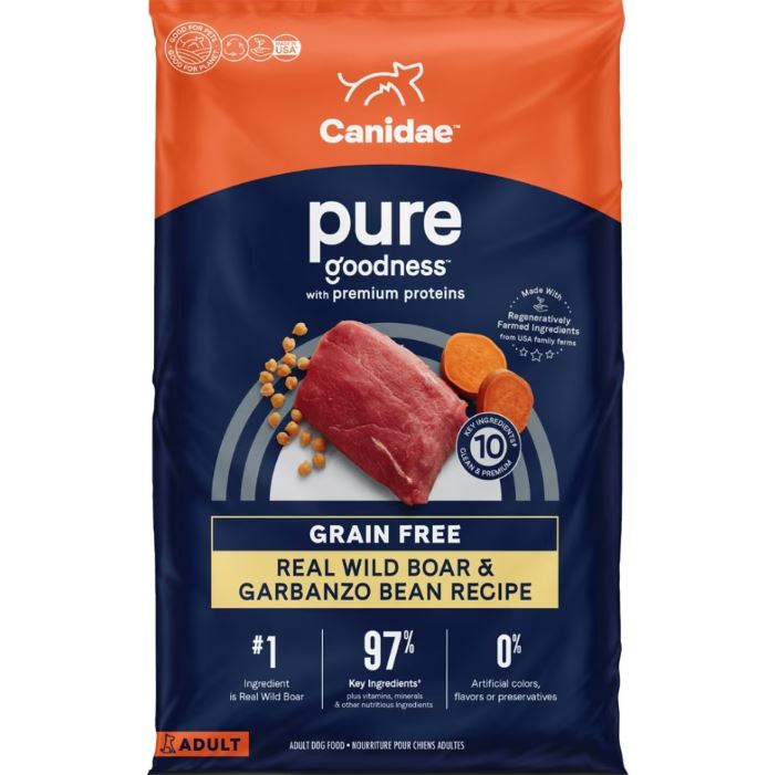 Canidae Pure features clean recipes, premum proteins and healthy fats to fuel your pet's health. Know what's in their bowl with just 10 key ingredients or fewer in every recipe. Featuring wild boar, a hearty meat from wild hogs that is a highly digestible protein and also enhances flavor for your pet.