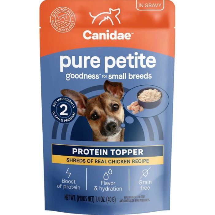 Add a boost of protein, flavor and hydration with Canidae's Pure Petite Protein Toppers. Made with chunks of real Chicken, this is a single animal protein source recipe with only 2 key ingredients. Made without corn, wheat or soy, and no artificial colors, flavors or preservatives.