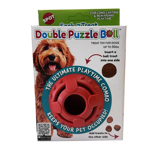 Seek-A-Treat Double Puzzle Ball is a durable rubber treat ball with two compartments to hold different sized treats. It provides long-lasting play time to occupy and stimulate your dog mentally. It's easy to use, easy to clean and freezer/dishwasher safe.