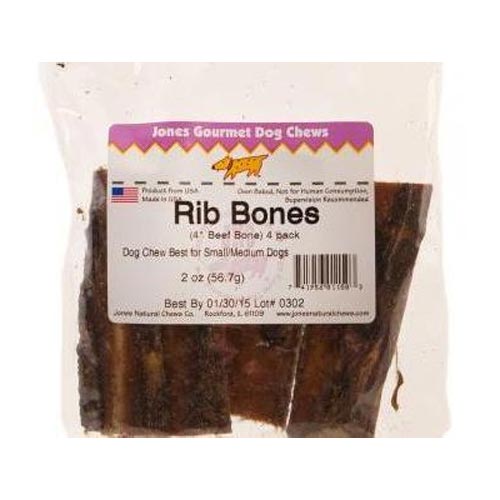Made in the USA! These Beef Rib Bones have meaty bits left on and are dipped in natural liquid smoked to enhance the natural flavor and to act as an anti-microbial that fights bacteria. Each Rib Bone is 2oz each, 4-5" long, and made for small to medium dogs. Comes in a 4-pack labeled 6 x 8 vinyl labeled bag.