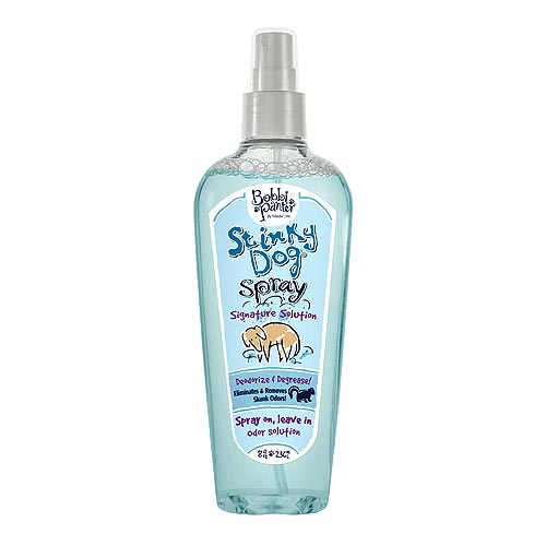 This spray-on, leave-in or wipe-off solution spray eliminates and neutralizes all odors, including skunk. Its natural derived deodorizer degreases by actually breaking down the enzyme in the oil the skunk sprays as well as all other odors. Stinky Dog Spray also moisturizes with Vitamin E, Lavender Extract, Rosemary and Aloe Vera Gel while it removes odors! Crisp and Clean fragrance.