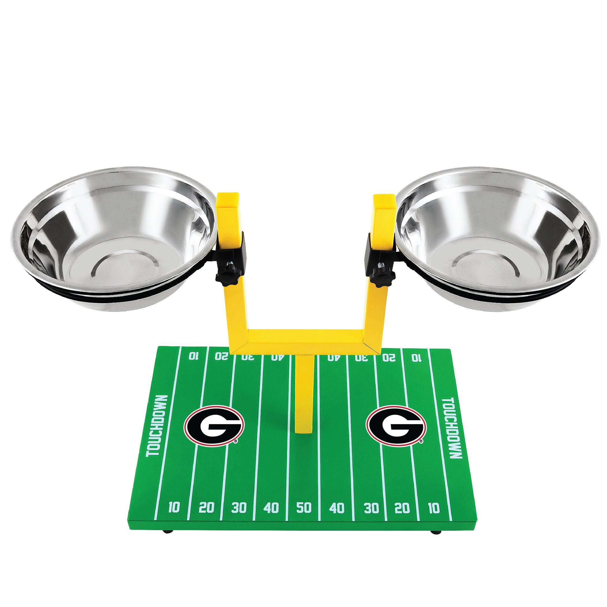 Crafted with durability in mind, this elevated feeder features two height-adjustable stainless steel bowls to support healthy eating posture for pets of all sizes. The non-slip, waterproof base is designed like a football field, complete with a fun goalpost accent for extra team spirit.