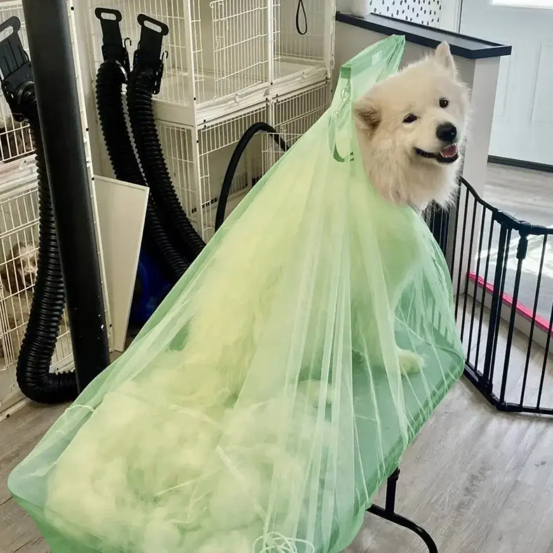 How to Use: Secure the dog with a grooming loop on the grooming arm. Place the Big Hair Net over the table, ensuring the face hole faces forward. Gently pull the dog’s head through the face hole and adjust the toggle for a comfortable fit. Tighten the bottom toggle under the table for full fur containment. Use a velocity dryer to blow out the trunk, chest, and back end of the dog. Once done, remove the net and collect the fur – cleanup is a breeze.