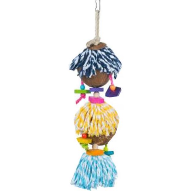 • Colorful, dangling pull toy designed to satisfy your birds foraging and engaging instincts • Made from an assortment of multicolor cotton ropes, coconut pieces, wooden blocks and plastic beads • This toy is meant to be pulled apart and deconstructed, providing your bird with mental stimulation and hours of fun • Add your own treat in the coconut shells to encourage birds to forage and engage. • The coconut shells and wooden blocks provide a rugged texture for beak and tongue exercise. • All materials are 100% pet safe with non-toxic, food grade colors and connect easily to cage with stainless steel quick link attachments