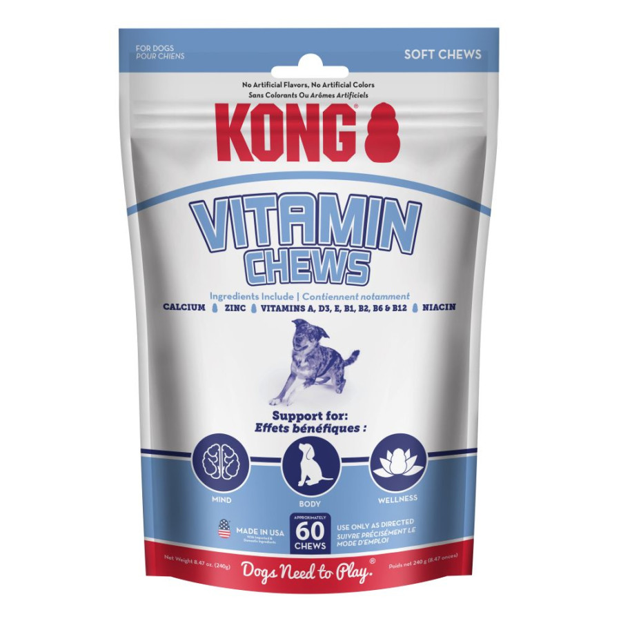 KONG Vitamin Chews deliver the vitamins and minerals that help keep dogs in peak condition, supporting physical and mental wellness so dogs can thrive. The soft, highly appetizing daily chews provide nutrients that maintain the health of all breeds of dogs, keeping dogs wagging throughout their lives. Ingredients include calcium, vitamin E and vitamin D. Made in the USA with no artificial colors or flavors. Use only as directed.