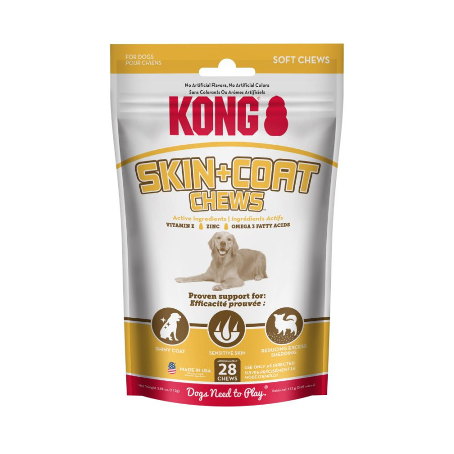 KONG Skin + Coat Chews help maintain skin and coat health to keep dogs shiny and free from dry, itchy skin. Tasty daily soft chews support dogs with sensitive skin of all breeds and ages. Omega-3 fatty acids, vitamin E and zinc help maintain skin’s normal moisture content and promote a soft, silky coat. No artificial colors or flavors. Made in the USA. Use only as directed.