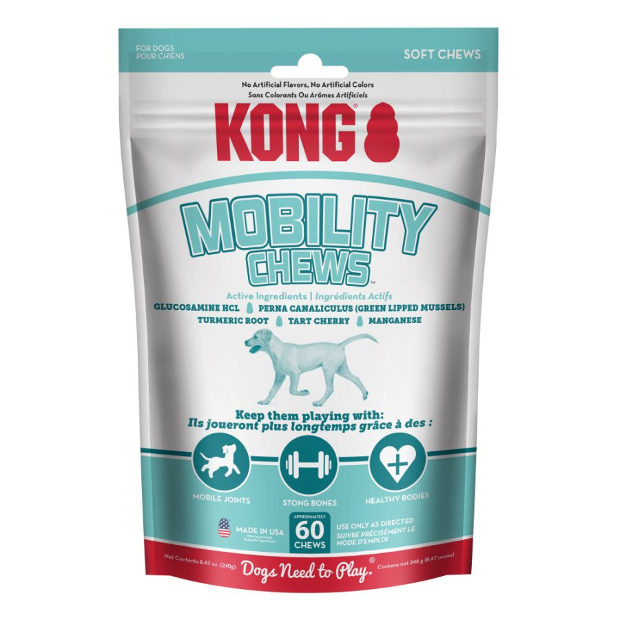 KONG Mobility Chews support bone and joint health to keep dogs playing. The soft, highly appetizing daily chews help maintain joint mobility and relieve occasional stiffness so dogs can play, fetch and wag through an active, healthy life. Ingredients include glucosamine, green-lipped mussels, turmeric and tart cherry. Made in the USA with no artificial colors or flavors. Use only as directed.