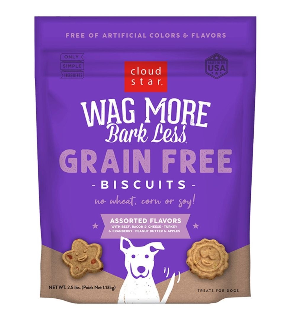 Crunchy biscuits, of course! Cloud Star's Wag More Bark Less Biscuits with Natural Assorted flavors offer guilt-free indulgence for your best friend.