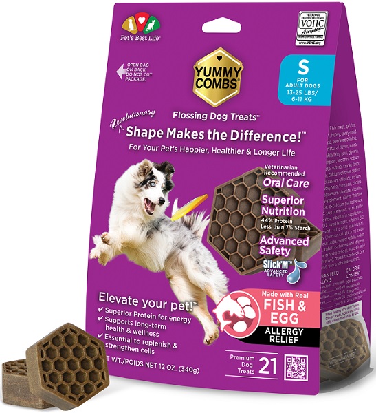 Reduce tartar buildup and bad breath with Yummy Combs Ingenious Oral Care Flossing Small Breed Grain-Free Adult Dog Treats! These all-natural dog dental treats are made with 44% protein to floss and scrub your pup's pearly whites down to the gumline. These paw-ticular goodies are specially crafted for small breed adult dogs and are made without gluten, grain or GMOs!