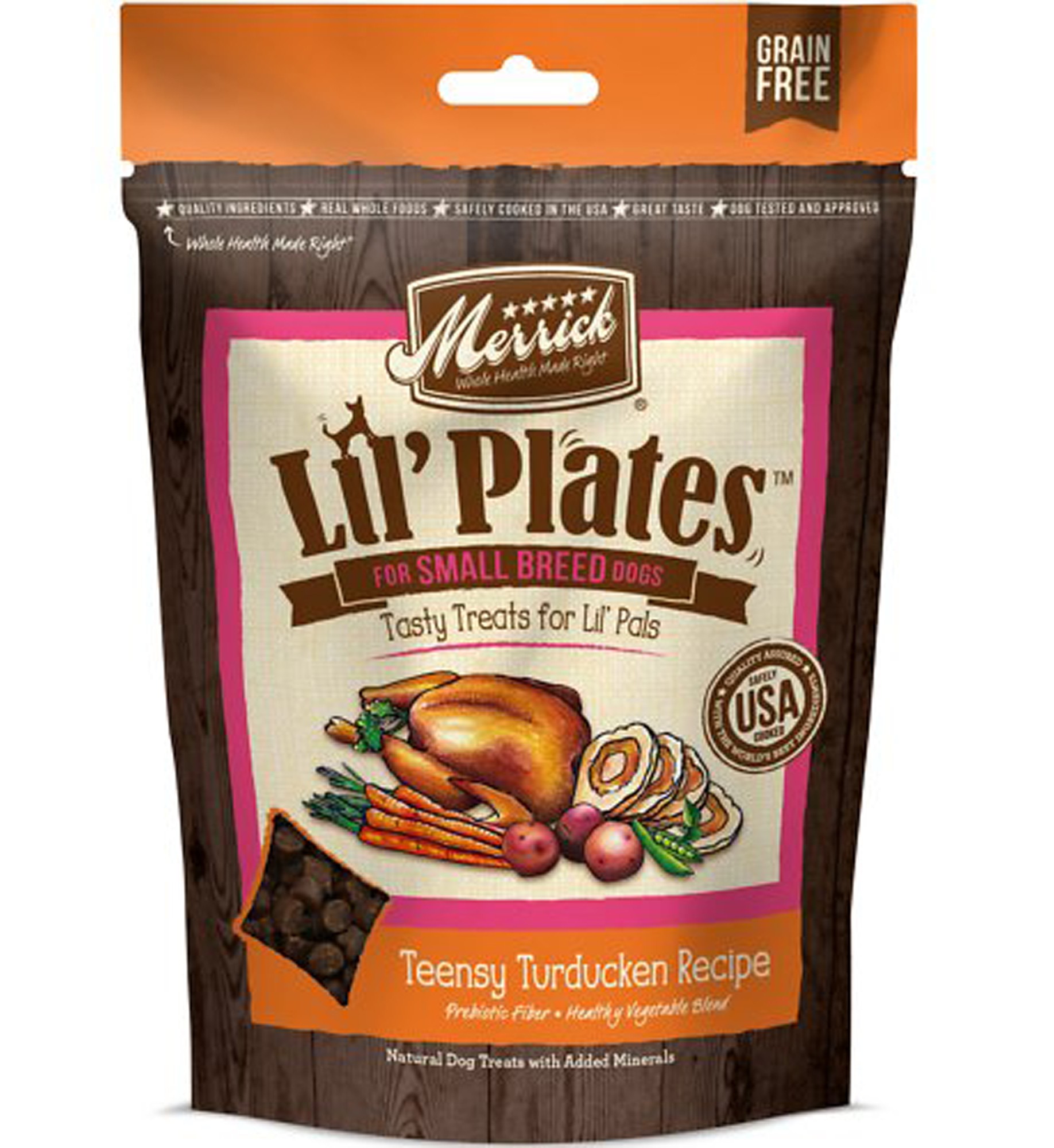 If you want big flavor and protein in a small size for your little dogs mouth, you want Merrick Lil' Plates Teensy Turducken Recipe Small Breed Dog Treats. The number one ingredient in these naturally healthy, soft dog treats is always real deboned turkey plus, a heaping helping of wholesome vegetables for wag-worthy taste. With prebiotic fiber for optimal digestion, and omega fatty acids for skin and coat support, they contain no artificial flavors, colors or preservatives and no gluten or grain. Formulated specifically for small breed adult dogs, these perfectly sized bites come in a number of fun shapes to make treat time extra exciting. They taste like a delectable blend of turkey, duck and chickenand are crafted in Merricks Hereford, Texas kitchen and cooked in the USA.