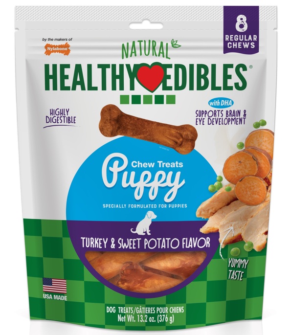 As a leader in the pet industry since 1955; Nylabone has been offering wholesome dog chew treats for decades. Specially formulated for puppies three months and older; Healthy Edibles Puppy Chew Treats help support furry friends wellness while providing a tasty way to occupy and reward. Each highly digestible; long-lasting chew treat contains DHA to aid in brain and eye development for growing pups. Plus; they include calcium to support strong teeth and bones and flaxseed to help maintain skin and coat health. These natural puppy treats do not contain any artificial ingredients for a guilt-free treating indulgence. Featuring delicious flavor pups love; these USA-made healthy puppy treats are sure to satisfy your new best friends cravings!