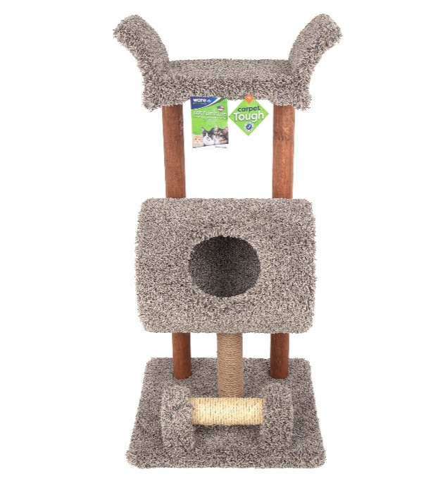 • Cozy hideout tunnel and lofty lounger on top • Multiple paw pleasing textures to scratch • Great for multi-cat household • Carpet Tough • Made in USA