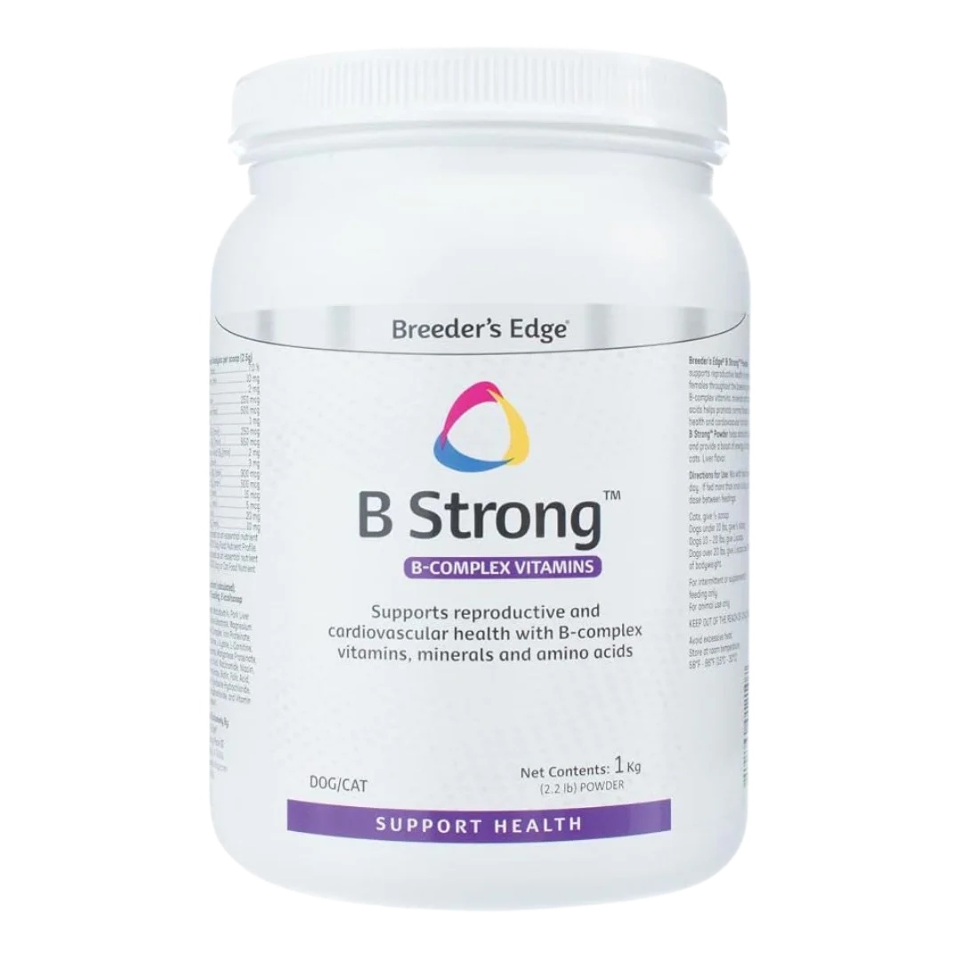 Breeder's Edge B Strong Powder vitamin B complex for dogs and cats that supports reproductive health and overall wellness.