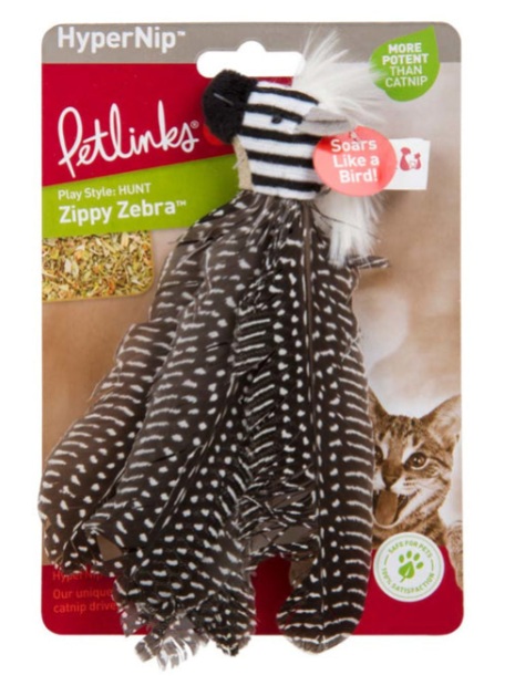 ",HappyNip is an exciting blend of silver vine and catnip. Silver vine, a wild-growing herb foraged in the mountains of Japan and China, has a strong natural effect on cats, even some that don't respond to catnip. After extensive testing to find the perfect blend, HappyNip was created as an ideal alternative for finicky felines who need a little extra excitement! It's more potent than catnip and as pure as can be! Most cats respond to catnip with a burst of energetic activity followed by a purrfectly calm mellow period Petlinks? Zippy Zebra a HappyNip toss and chase feather toy with a new patented play solution replicates the motion of a badminton birdy with Extra-long feathers and faux fur that cats can't quit! Petlinks? gives pet parents the best of all worlds: innovative products, stylish designs, environmental responsibility, and exceptional value with a variety of toys, scratchers and beds to meet a pet's need for play, scratching, wellness, retreat, rest, and fun! Petlinks? products are designed to meet child safety standards and are backed by our 100% satisfaction guarantee. If a customer is dissatisfied with a Petlinks? product for any reason, we will replace or refund it.