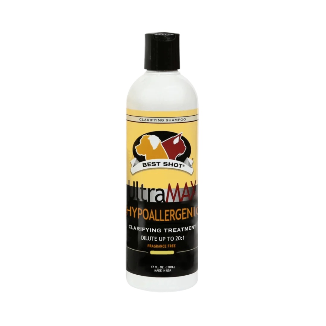 Best Shot UltraMAX Hypoallergenic Clarifying Shampoo is a gentle, fragrance-free formula designed to remove stubborn buildup while keeping dogs’ coats healthy and soft.