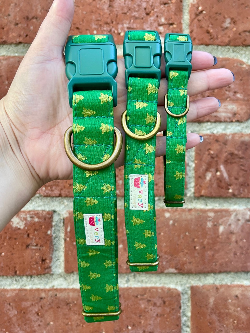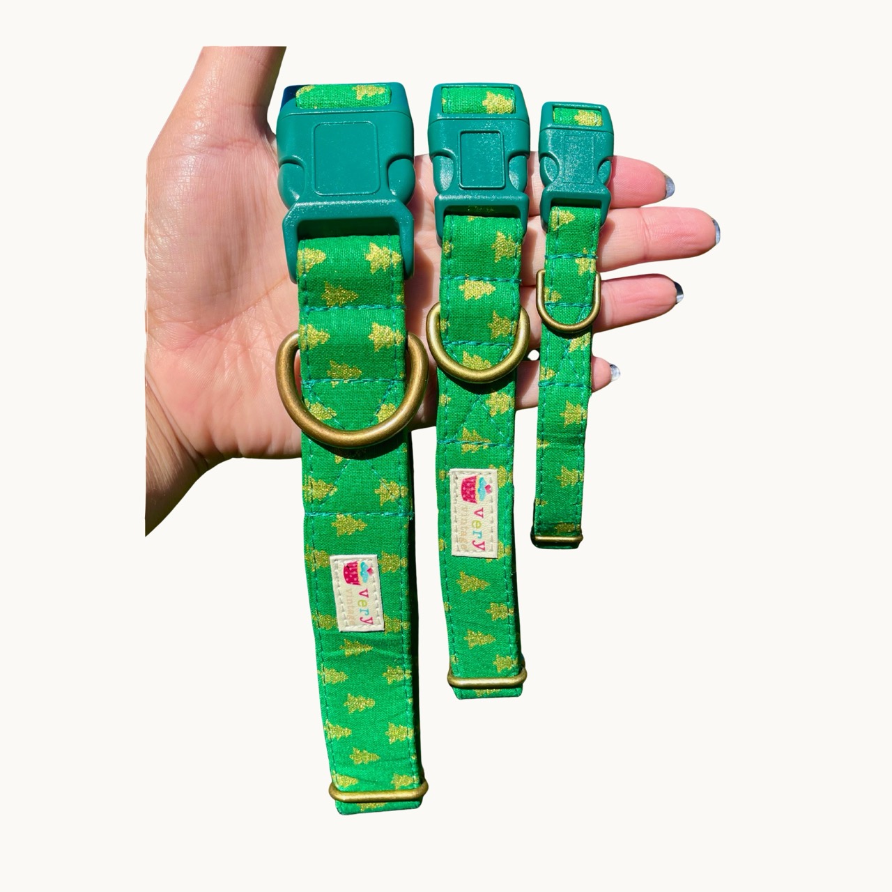 Pine Trees – Green & Gold Holiday Dog Collar | Handmade Organic Cotton Collar | Adjustable Dog Collar | Handmade Organic Cotton Collars & Leashes